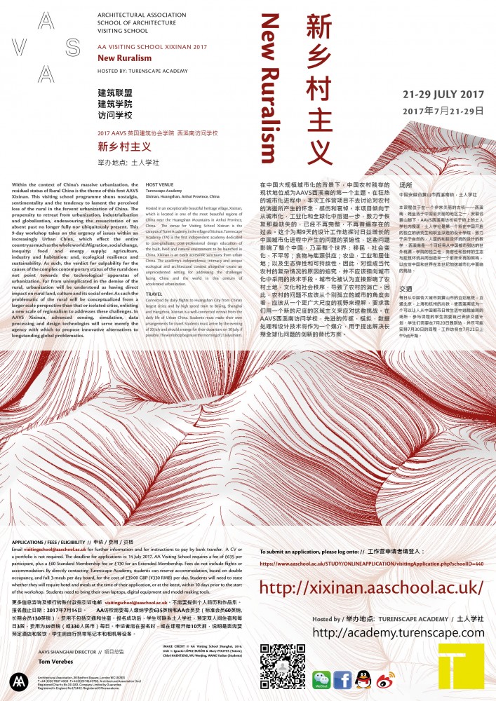 Hosted in an exceptionally beautiful heritage village, Xixinan, which is located in one of the most beautiful regions of China near the Huangshan Mountains in Anhui Province, China. The venue for Visiting School Xixinan is the campus of Turen Academy, in the village of Xixinan. Turen Academy (TA) is the first independent academy dedicated to post-graduate, post-professional design education of the built, lived and natural environment to be launched in China. Xixinan is an easily accessible sanctuary from urban China. The academy’s independence, intimacy and unique ecological and architectural context altogether create an unprecedented setting for addressing the challenges facing China and the world in this century of accelerated urbanization.