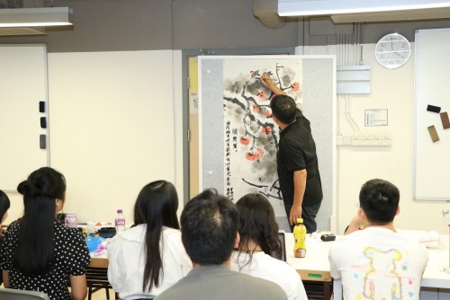Fisrt of all, Professor Ma introduced the history, techniques, and aesthetic features of flower and bird painting, allowing students to understand the profound cultural heritage of traditional art forms; then he focused on the creative process of flower and bird painting and drew a horizontal scroll painting on the spot, choosing red persimmons and a flock of sparrows as the subject matter, symbolizing the abundant teaching achievements; and during the real-time creative demonstration, he gradually showed every creative step from conception to completion, shared the tools and materials used, and helped students gain a deeper understanding of the techniques and concepts behind the creation.