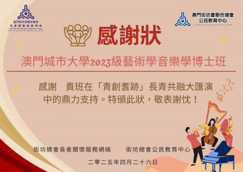 On April 26, the Musicology doctoral program of City University's Faculty of Innovative and Design successfully supported the Civic Education Center of Macau Federation of Neighborhood Associations in organizing the "Youth Innovation & Senior Legacy" Intergenerational Harmony Gala at the Federation's Art Journey Center.