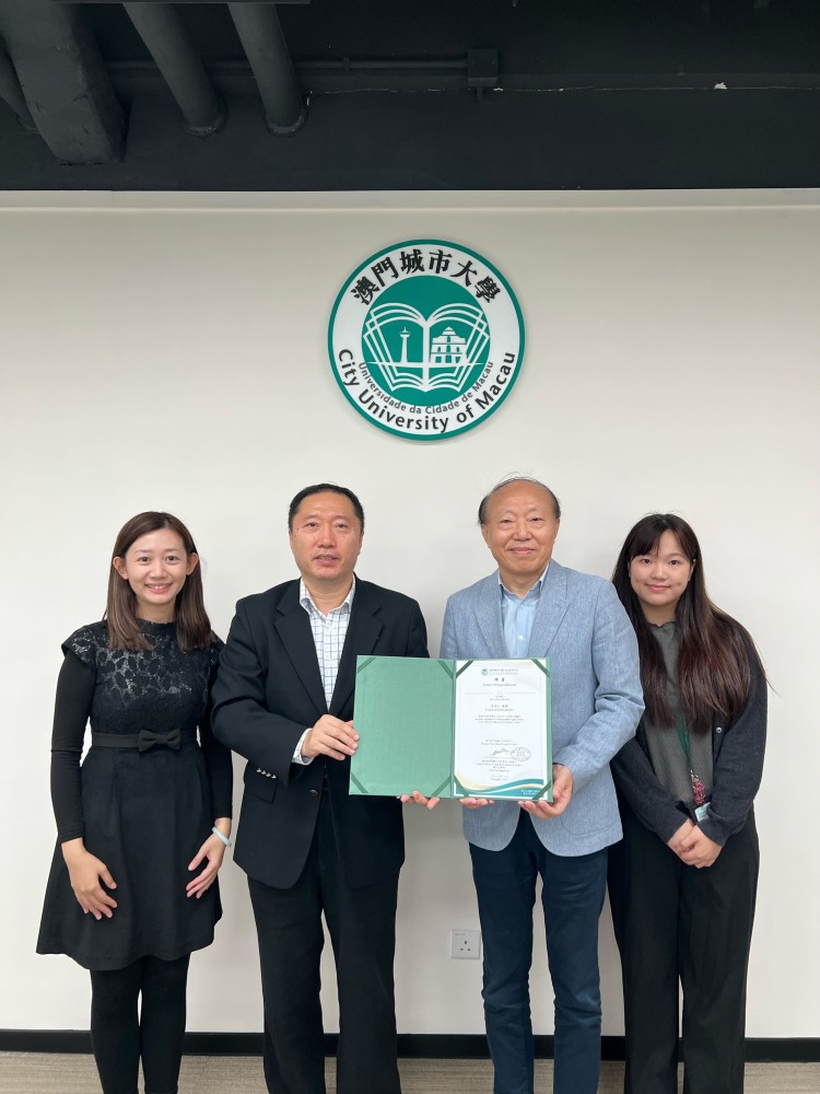 Professor Dai Dingcheng, Director of the Macau Urban Music Research Center under the Faculty of Innovation and Design at City University of Macau, alongside Assistant Professor Cecilia I-Ian Long, Deputy Director, and Ms Lam Wai U, Administrative Supervisor, recently visited Associate Professor Li Hongjiang, Director of the Master of Law Programme at City University of Macau. They formally presented an appointment letter to Director Li, following prior discussions, inviting him to serve as the Center's Distinguished Legal Advisor.