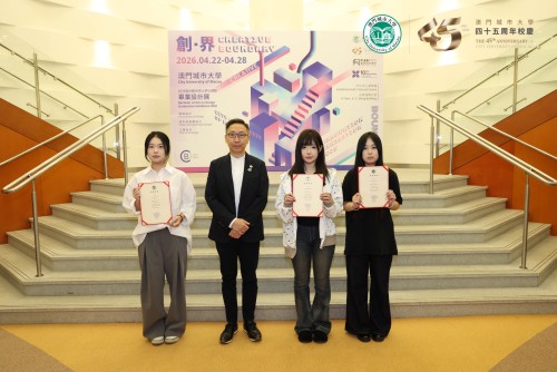 Distinguished guests attending the opening ceremony included Ms. Lei Im Kei, Acting Head of the Student Services Department of the Education and Youth Development Bureau; Mr. Van Pou Lon, Chief of the Division of Visual Art of the Cultural Affairs Bureau; Ms. Hong Pui Leng, Acting Head of the Promotion and Production Department, Macao Government Tourism Office; Professor So Kam Hung, Pro-Rector, City University of Macau; and Professor Wang Po-Hsun, Executive Associate Dean of the Faculty of Innovation and Design. The guests jointly officiated the opening ceremony.