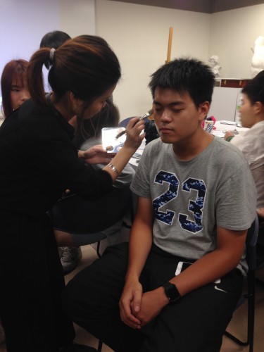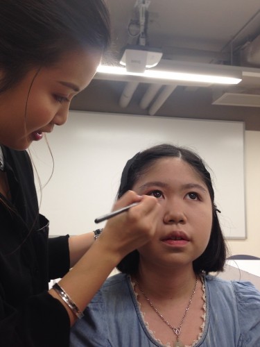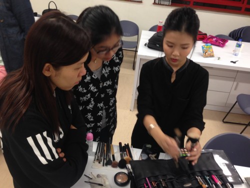 The most exciting moment of the whole lecture was her demonstration part. One of our female students volunteered for modeling. Everyone from the class closely watched Ms. Leung play magical palette on her face, which turned a rounded reddish face into a natural skin tone with a very clear-cut facial feature.
